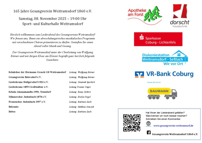 Am Dienstag, den 30.07.2024 trafen sich die Sängerinnen und Sänger zur gewohnten Zeit um 19.00 Uhr zur letzten Singstunde 2024 vor der Sommerpause im Sportheim Weitramsdorf. Diesmal war es eine besondere Singstunde, denn an diesem Abend wurden Mitglieder für langjähriges Singen im Chor geehrt. Zu diesem besonderen Anlass waren Bürgermeister Hans Steinfelder und der stellvertretende Vorsitzende Heinz Heilingloh vom Sängerkreis Coburg-Kronach-Lichtenfels zu Gast. Folgende Sängerinnen und Sänger wurden geehrt